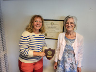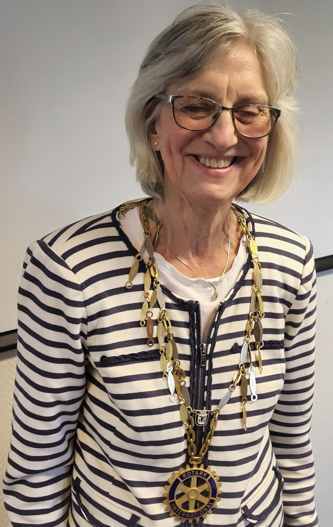 Det nye Rotary-året startet på tradisjonelt vis ved at Presidenten overrakte plakett til Past President Evy Ann Hagen som bevis på hennes presidentperiode 2023-2024.
