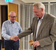 Ole Petter Bernhus mottar klubbens kaffekopp som takk for et interessant foredrag.